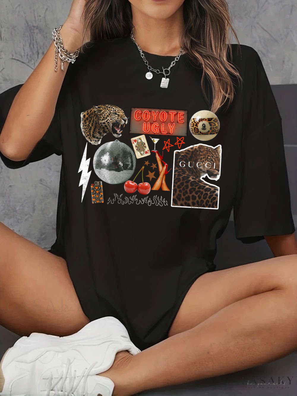 Turn heads with this bold oversized tee featuring a mix of retro, edgy, and high-fashion inspired graphics. From the neon Coyote Ugly sign to the disco ball, leopard, and cherry details, this shirt brings together all the vibes for a night out or a casual streetwear look.